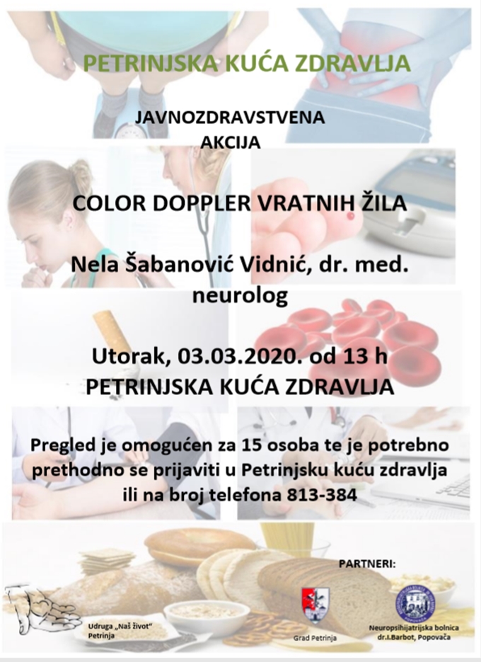Petrinjska kuća zdravlja organizira javnozdravstvenu akciju Color doppler vratnih žila u utorak 3.ožujka 2020. od 13h. Pregled će obavljati Nela Šabanović Vidnić, dr.med.neurolog.